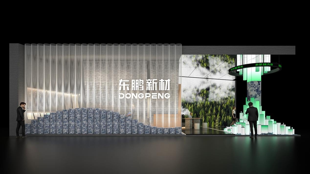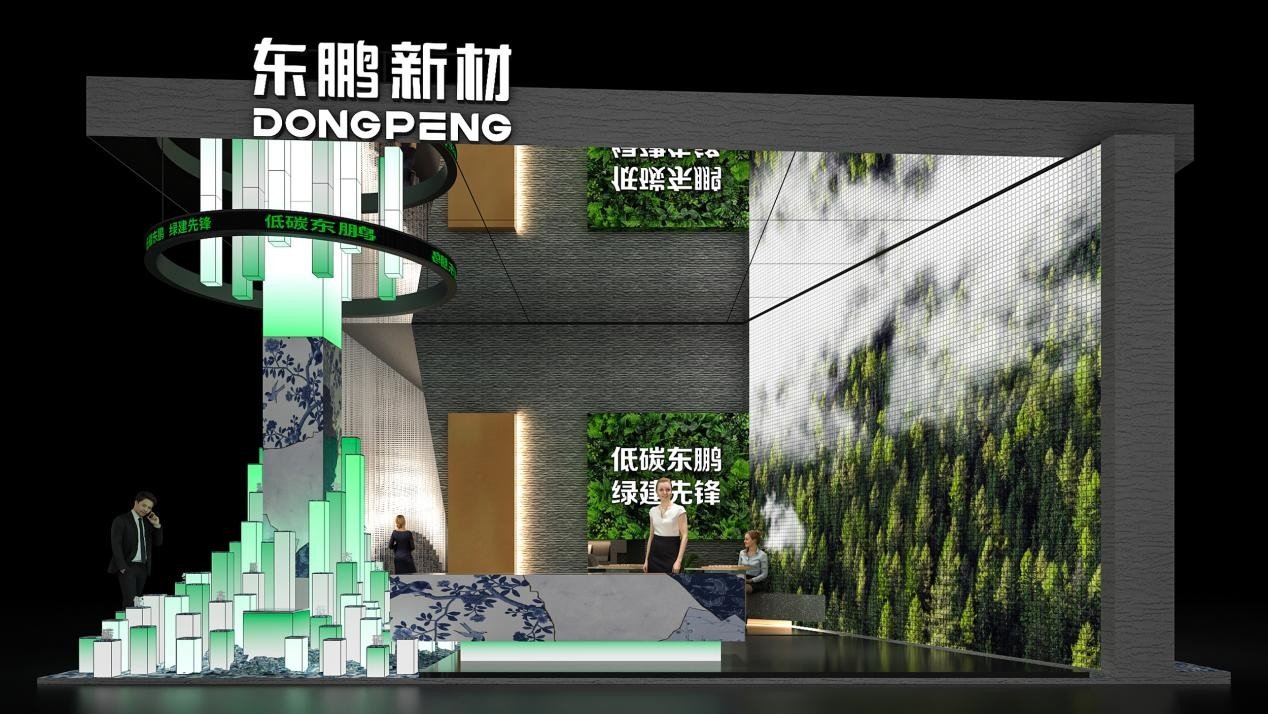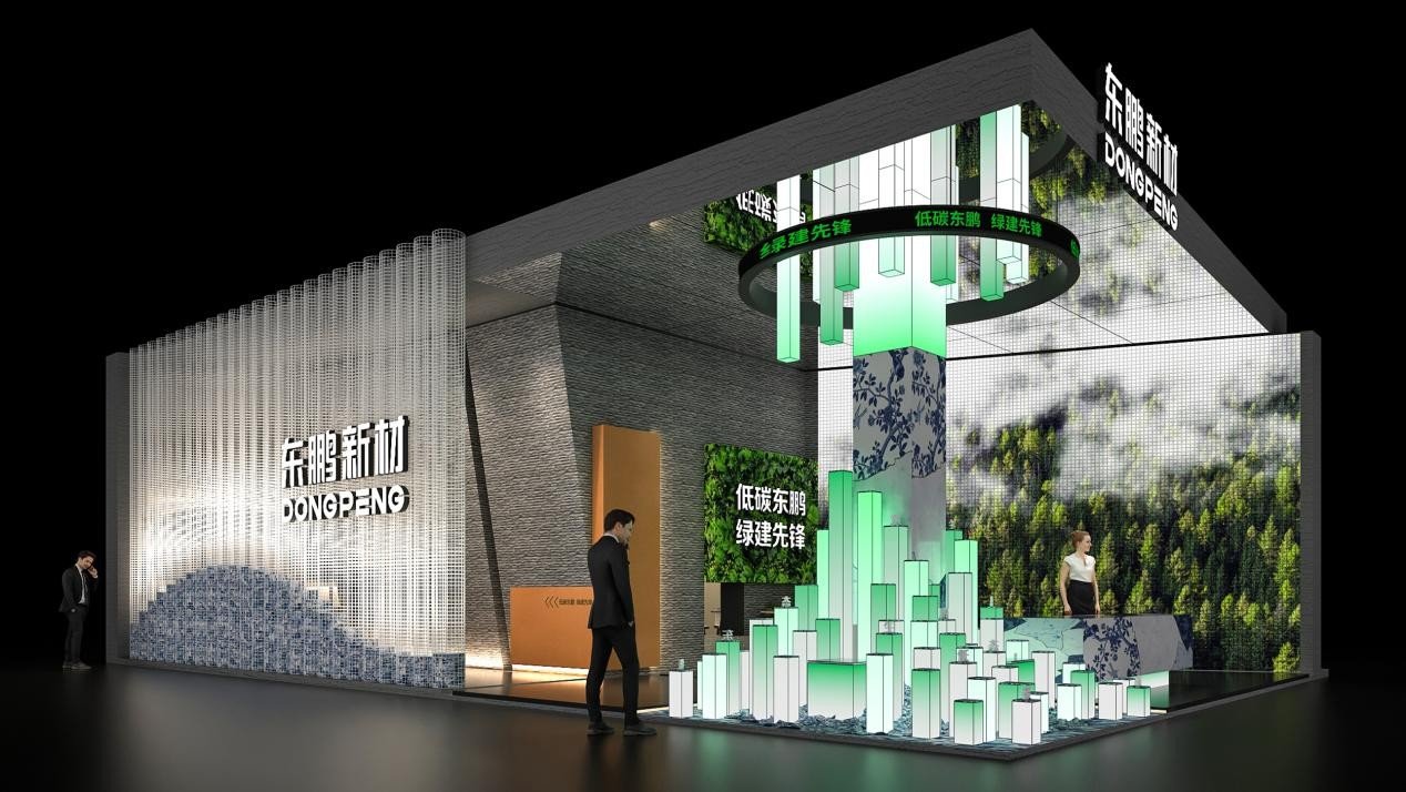 东鹏新材展馆以“固废循环,城市再生”为设计灵感,馆外以震撼人心的“碎瓷固废艺术墙”装置,以及运用碎瓷和碎石固废、高低错落的时尚长方体矩阵与东鹏日用瓷生态石擎天柱融合,再加上声光电一体化氛围设计,打造一座数字科技、绿色循环的“生态石再生城市”,为观众带来一场沉浸式视听盛宴,充分诠释“东鹏新材、绿建未来”的主题,彰显东鹏集团“向下扎根、向上生长、向善发展”的低碳发展理念。