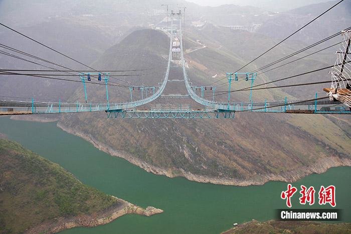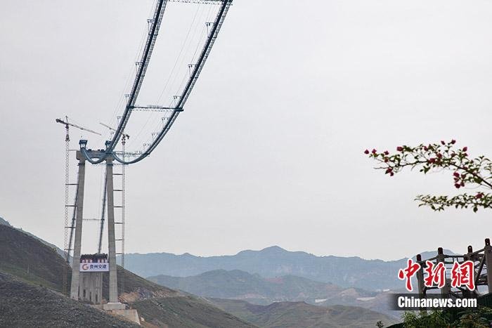 全长超过2000米牂牁江大桥猫道。 中新网记者 葛成 摄