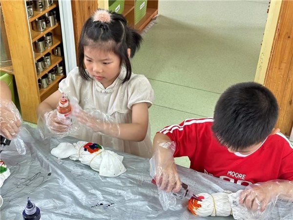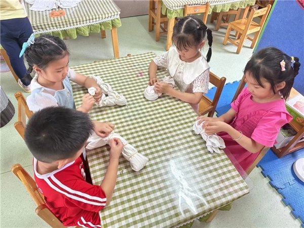 活动前,助教老师通过视频简单介绍了扎染工艺的历史。结合课件,引导小朋友欣赏了扎染作品并现场示范扎染的方法。原来扎染是这么有创意又有趣的活动!