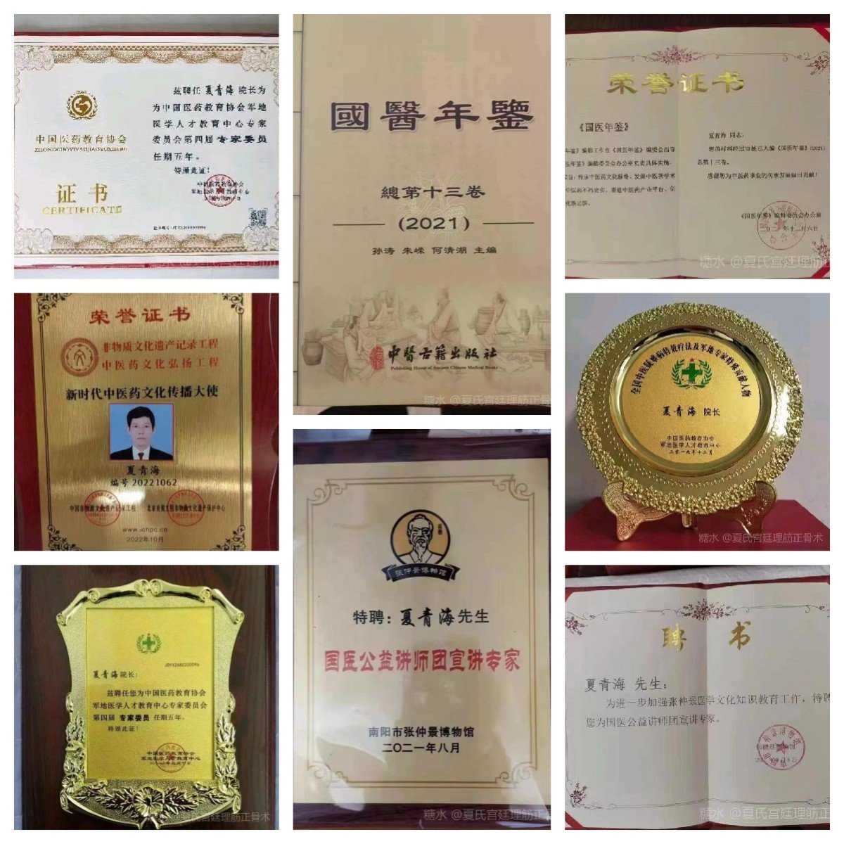 祖国传统医药渊远流长,流派纷呈,代代相传。从古至今,无数的传统医药继承人,倾力造福社会,业绩令人称颂。夏青海馆长,以其精湛的医术、高尚的医德,赢得了广大患者的一致好评,成为了众人眼中的名医,得到了有关部门的认可与青睐,使其获奖无数,目前担任,中国医药教育协会聘为专家委员;张仲景博物馆国医讲师团专家;大国医学网名誉副主席;第一健康时报特聘专家;广东惠州康复学会理事长;中国道医协会全真派高级道医;中医药适宜技术培训导师;获得,国医药教育协会疑难杂症疗法国家贡献奖获得者;在北京孵德中医院理骨术竞赛中荣获第二名。大医精诚,国医圣手,悬壶济世等荣誉称号。