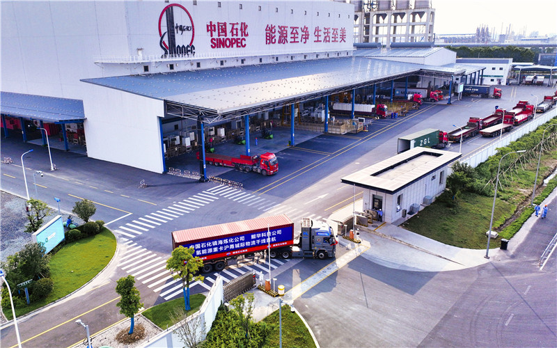 ↑中国石化镇海基地2号聚烯烃立体库前,物流重卡繁忙往来