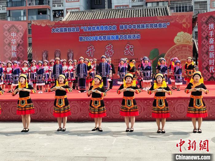 7月11日,广西河池市大化瑶族自治县举办2023年布努瑶“祝著节”庆祝活动。图为民众表演《瑶族敬酒歌》。中新社记者 黄艳梅 摄