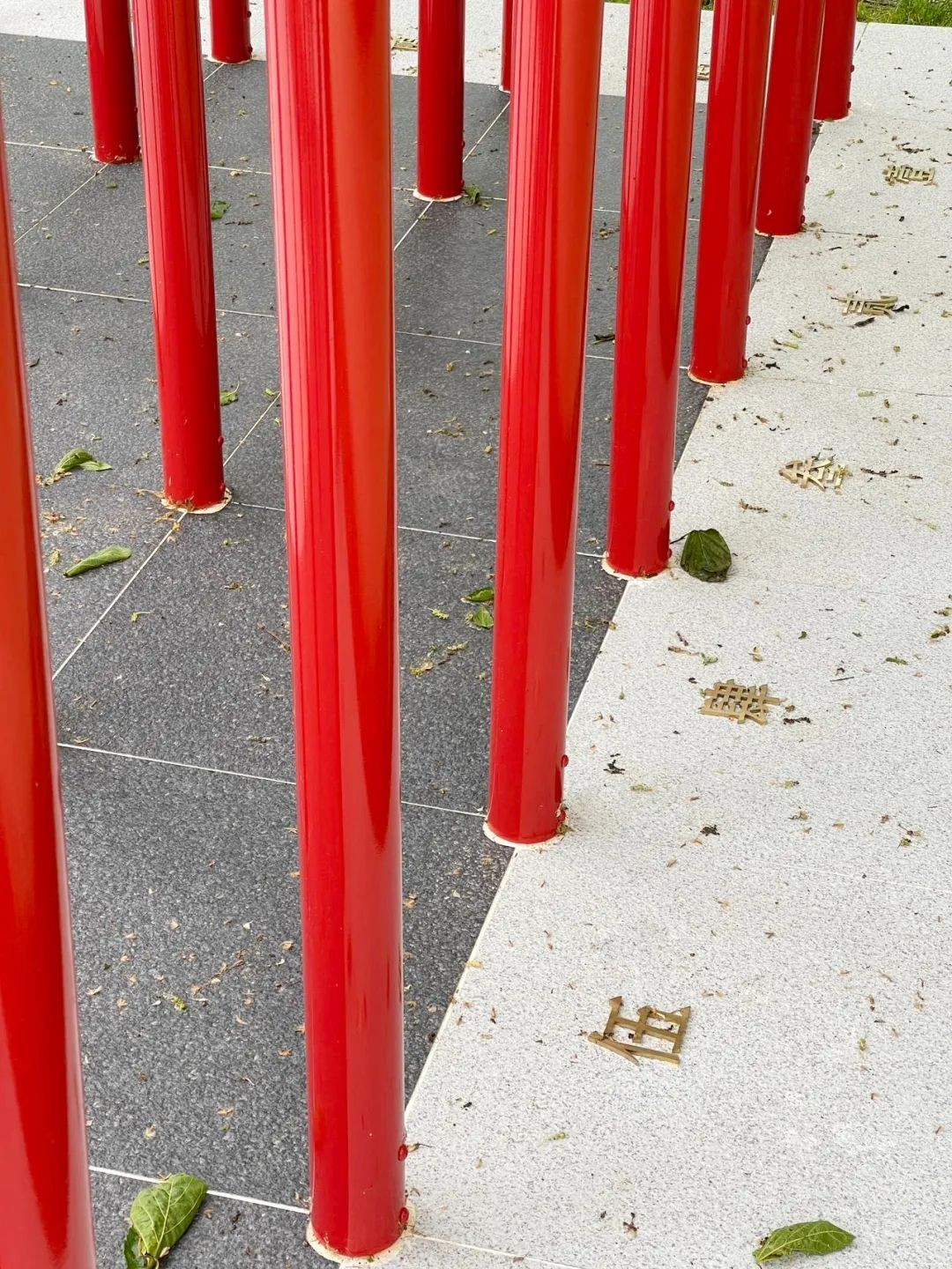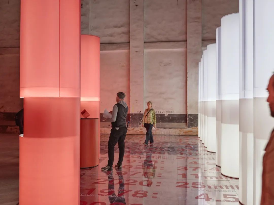 在室内空间,以东鹏岩板·红色小牛皮打造出一款独特的圆柱台,与展馆的红色调相呼应,确保空间整体氛围相互贴合,为游客提供更好的参观体验。