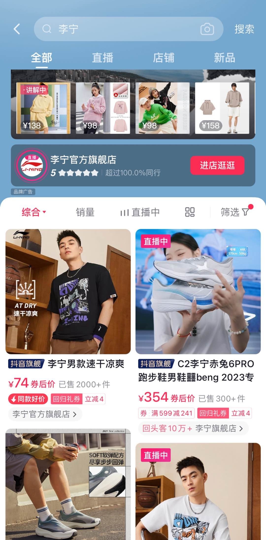 与此同时,抖音电商开新日还通过达人口播、置顶落地页、挂载搜索词引流李宁篮球旗舰店直播间与卖场,在种草的同时也直接加速转化,整个过程又快、又准、又稳。在“人找货”和“货找人”的双向链路帮助下,助力李宁实现了新品营销“品效销”几何级的增长。