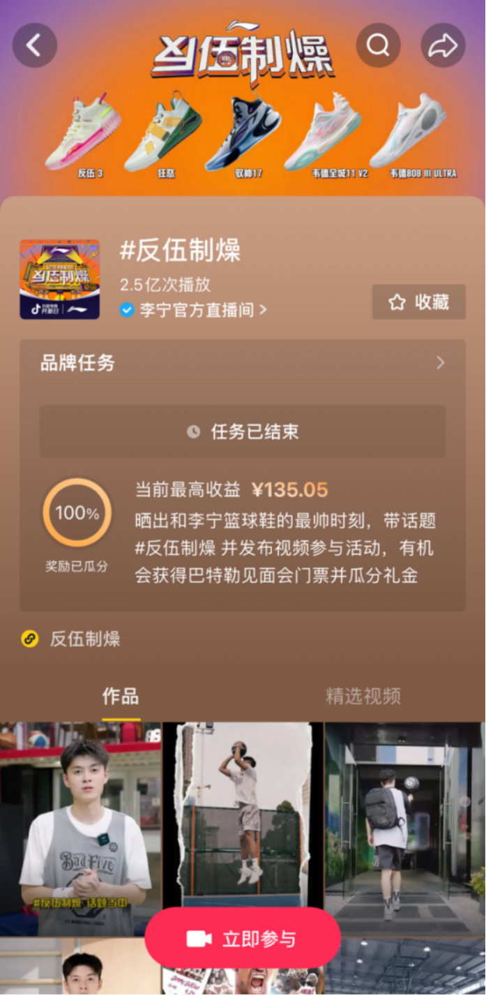一方面,抖音电商开新日延续了发起挑战这个抖音原生内容推广的主流方式,并结合李宁反伍叁加壹怒沸撕系列赛事决赛热点,在平台发布了李宁全民任务挑战赛#反伍制燥,鼓励篮球爱好者通过参与短视频录制,关注和参与李宁叁加壹联赛“反伍怒沸撕星决战”及巴特勒中国行活动。