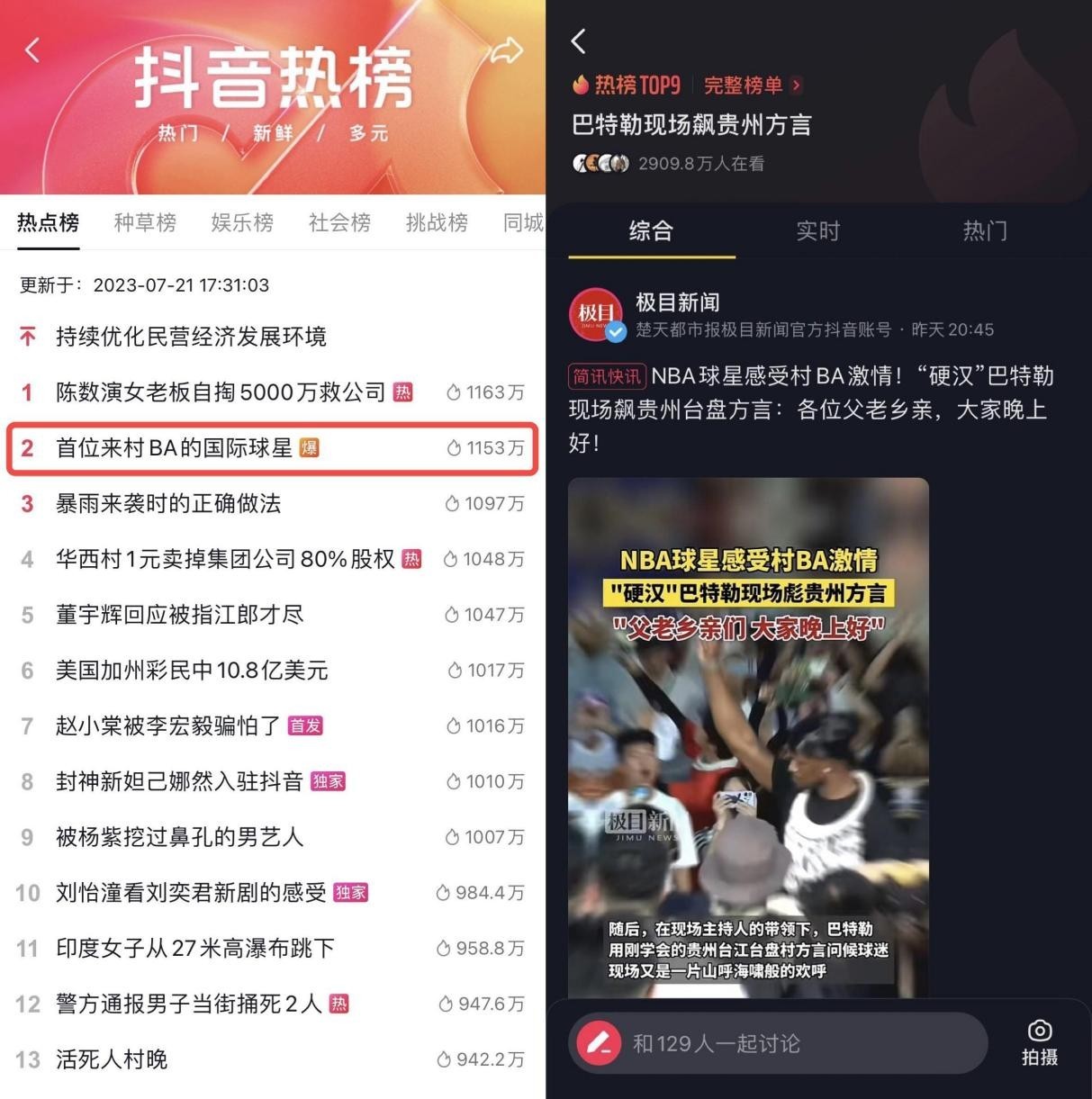 在巴特勒中国行期间,几乎每一站行程都吸引了众多站内外用户关注。其中,巴特勒也是以#首位来村BA的国际球星 话题登抖音热榜TOP2。而巴特勒中国行事件持续的热度,在开新日活动期间不断引流用户进入李宁篮球旗舰店和直播间,为销售延续火力。