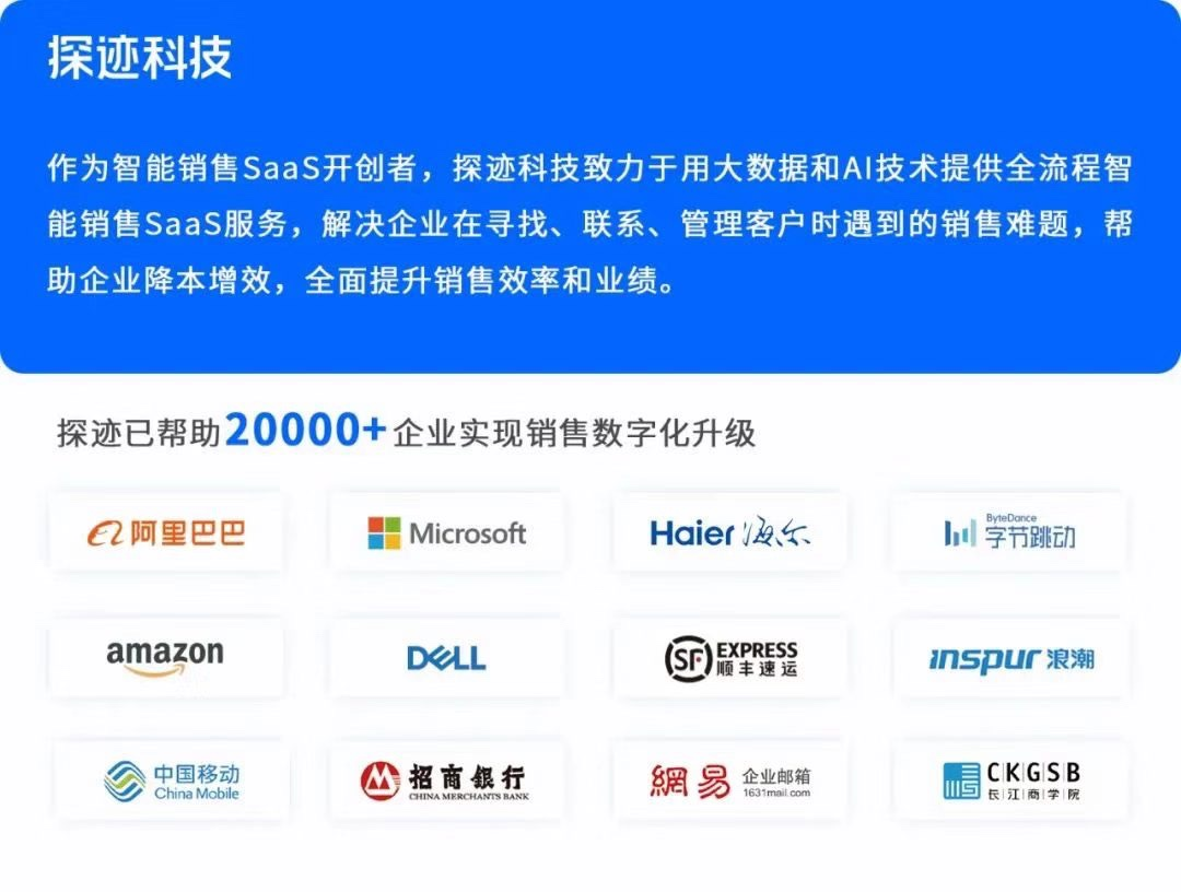 覆盖各行各业超过10000个数据维度,汇集丰富的社交人脉信息及联系方式数据。让你全方位多角度地深入了解客户。因此,对于任何想要扩大市场份额、提升品牌影响力或增加销售额的企业来说,探迹CRM钉钉版能够精准把握合作切入点,是一个不可或缺的利器。