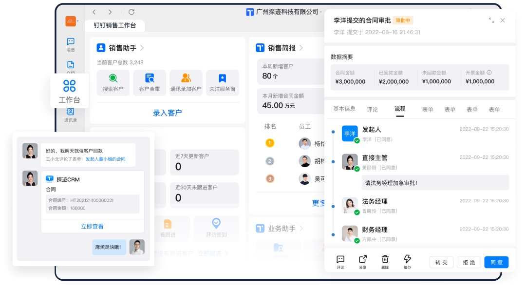 探迹CRM钉钉版实现与钉钉日程、待办、OA审批的打通,关联数据更加高效省时。譬如财务在核算团队业绩或成本时,可直接引用销售合同数据,工作效率大大提升;