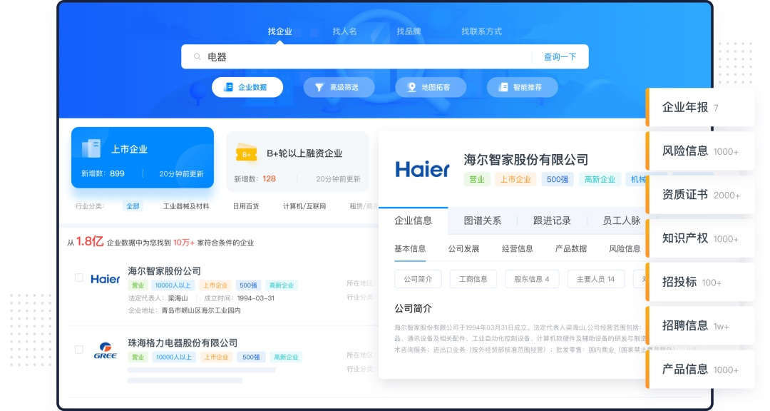 在营销拓客的环节,探迹CRM钉钉版基于1.8亿+家企业全量知识图谱,采用智能化分析和筛选数据,提供多种渠道获取潜在客户信息,将最具价值的目标客户呈现给您。