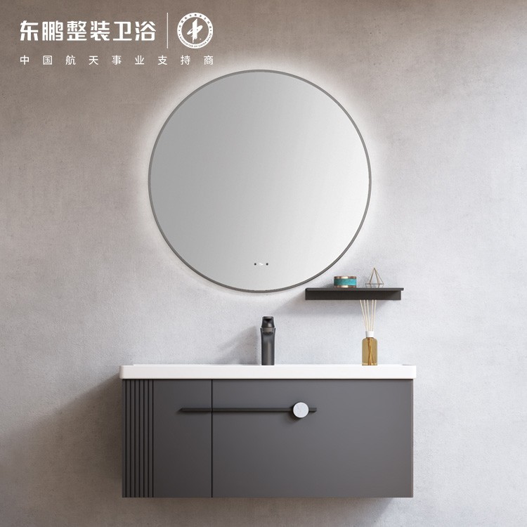 东鹏整装卫浴浴室柜GA1014Q0_100,采用简洁利落的几何化线条设计,以高级深空灰搭配烟熏橡木,为空间增添轻奢质感;提供挥手即亮的智能圆镜、健康易洁的一体台盆与储物灵活的多元收纳,打造美观与实用并存的生活体验。