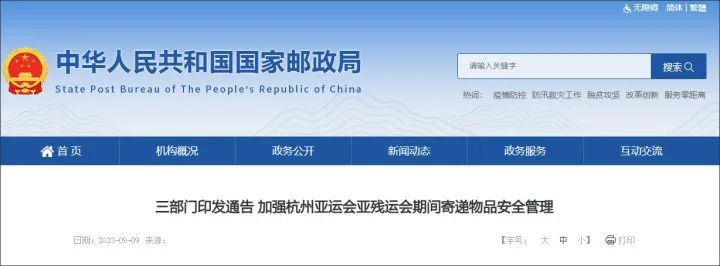 近日,国家邮政局、公安部、国家安全部联合印发《关于加强第19届亚洲运动会和第4届亚洲残疾人运动会期间寄递物品安全管理的通告》(以下简称《通告》)。