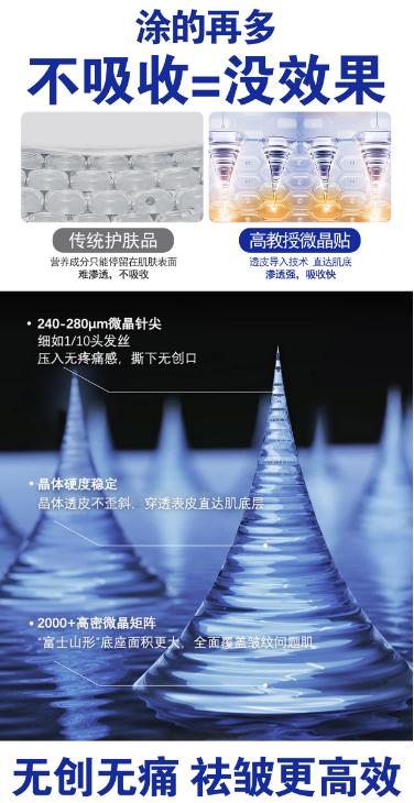 高教授微晶祛皱一改传统祛皱思路,将涂抹速溶护肤的优势与医美抗皱的特点相结合,采用纳米微晶技术,把大分子的有效去皱精华浓缩固化为可溶性纳米级晶体,让每一滴精华都被肌肤吸收、不浪费,深入皮肤最底层,由内而外的养护肌肤,从根源修护皱纹,帮助胶原蛋白再生、赋活细胞。相较于传统淡皱产品不到5%的皮肤吸收率,高教授微晶祛皱利用无痛纳米微晶透皮导入技术,皮肤吸收率直接提升到了95%,是传统产品的数十倍!