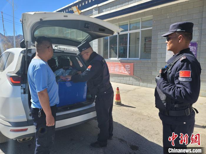 图为西藏日喀则边境管理支队鲁鲁边境检查站民警对过往车辆及随车人员进行检查。 鲁鲁边境检查站供图