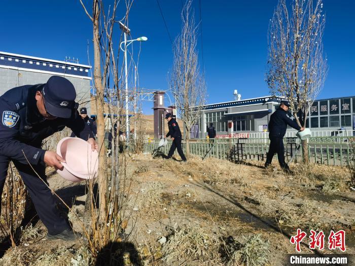 图为鲁鲁边境检查站组织民警在营区周边和查验通道附近开展冬灌排水、施肥等绿化养护工作。 鲁鲁边境检查站供图