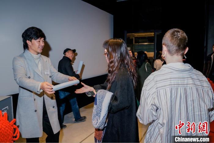 《脐带》制片人刘辉赠送观众电影海报。彦杰 摄