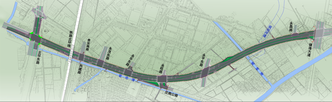该工程南起北环东路,向北以地面形式下穿洪镇铁路桥,与镇海大道平交,路线全长约2.4公里,设计速度60公里/小时,双向八车道,路基宽度为60米。