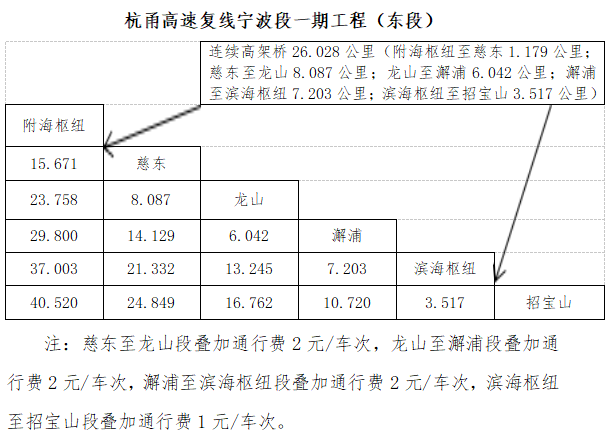 举例:以一辆普通7座以下客车为例,从镇海招宝山收费站到慈东收费站,全程约24.849公里,通行费为:0.4元/公里×24.849公里+7元大桥叠加费+5元车次费(货车没有车次费)=21.9元。如果车辆再往前开到小曹娥收费站下,那么通行费为:0.4元/公里×(55.83公里+共线已开通路段23公里)+7元大桥叠加费+5元车次费=43.53元。