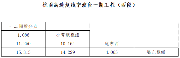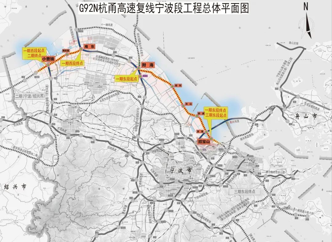 杭甬高速复线宁波段一期分为东西两段,其中西段起点位于小曹娥朗海村,设置小曹娥枢纽互通,终点位于庵东枢纽,全长15.315公里;东段起点位于附海枢纽,终点位于镇海区后海塘东北侧,设置威海互通立交接威海路,全长40.518公里。全线采用双向六车道高速公路标准建设,设计速度120公里/小时,设置匝道收费站6处(小曹娥收费站、庵东西收费站、慈东收费站、龙山收费站、澥浦收费站和招宝山收费站)。