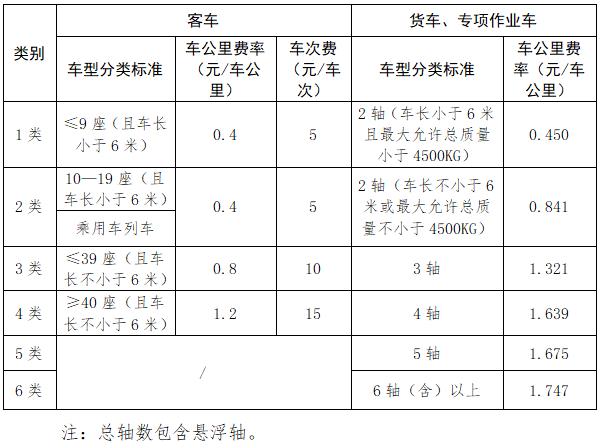 相关车型的收费里程,详见下表(最终收费标准以省政府批复为准)