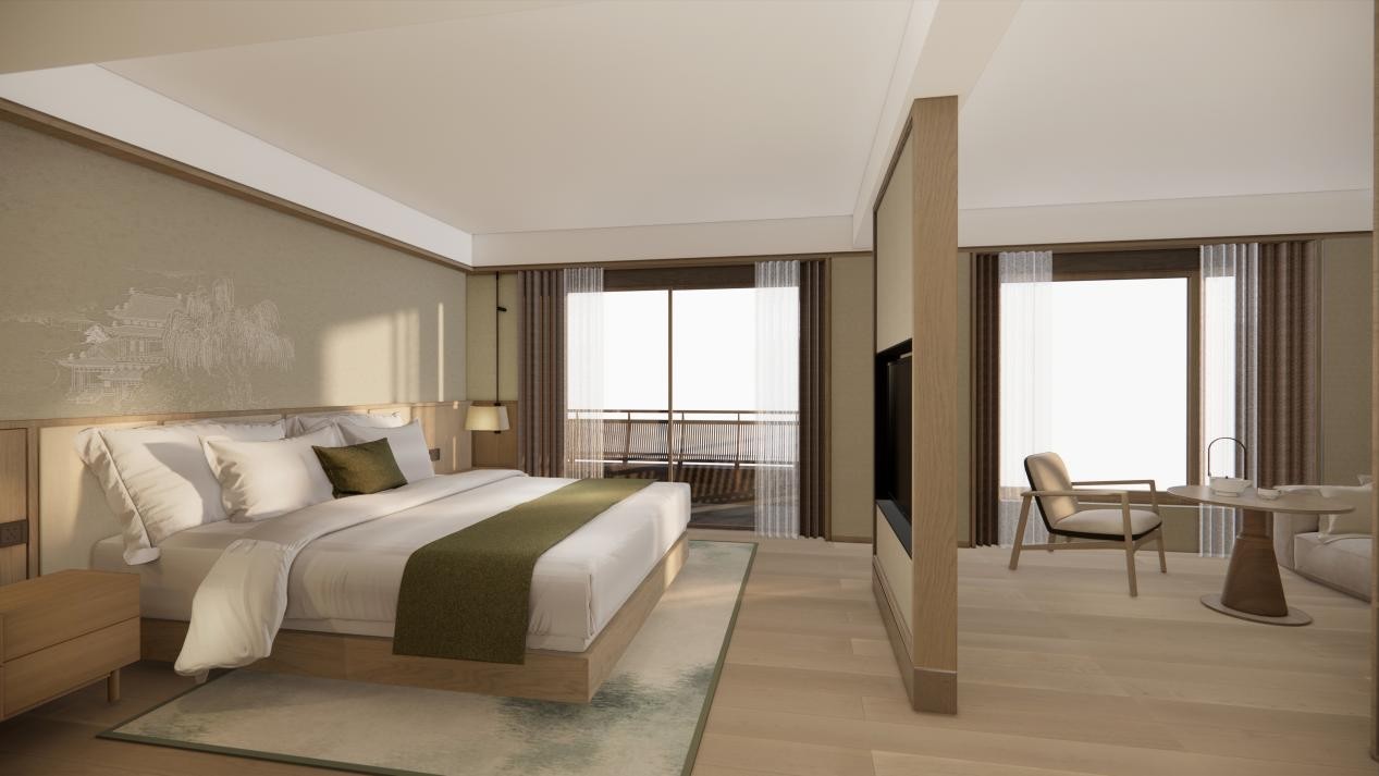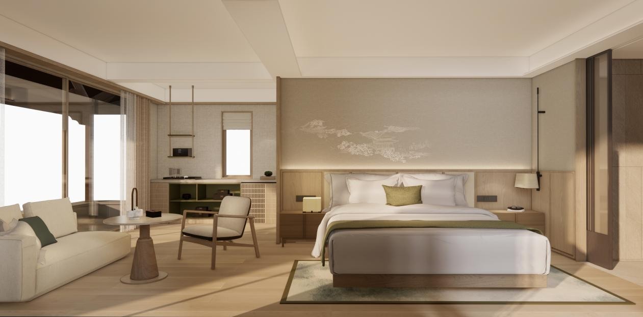 与山水为邻,择一隅安居。客房采用明快的暖色调,注重旅居疗养的高品质和体验感,传递出家的温暖,提供琴棋书画诗酒茶的韵味生活。