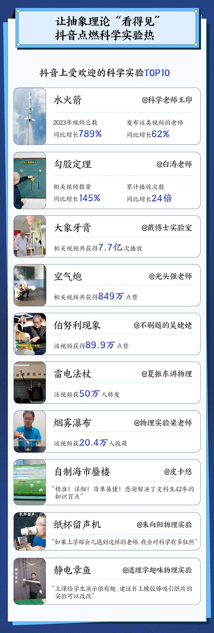 《报告》还统计了抖音上深受网友欢迎的十大科学实验,包括@不刷题的吴姥姥 用流水和乒乓球演示“伯努利现象”,@夏振东讲物理 自制“雷电法杖”讲电流,@物理实验梁老师 还原了“烟雾瀑布”,@朱向阳物理实验 做出了“纸杯留声机”,@道理学趣味物理实验 演示“静电章鱼”等。