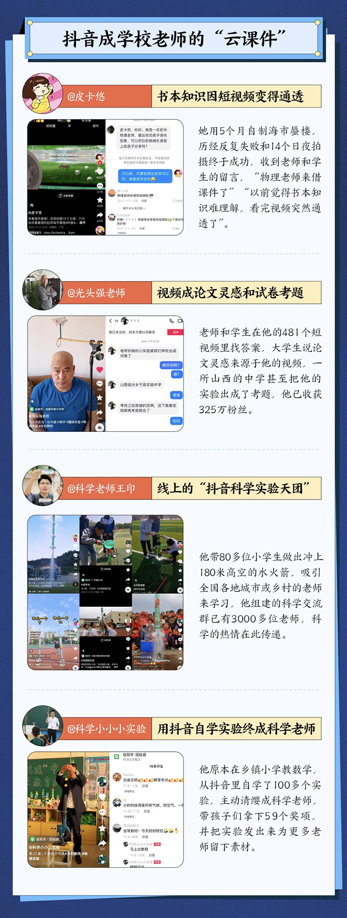 辽宁抚顺中学物理老师 @光头强老师 发布了481个科学实验视频,收获325万粉丝。他制作的空气炮,“嘭”的一声,可把烟雾发射到教室另一头,打翻排列整齐的易拉罐。有大学生表示论文灵感就来源于他的视频;一所山西的中学甚至把他的实验出成了考题。