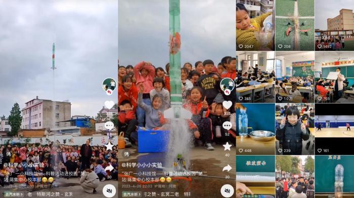 “水火箭”实验出现在《义务教育小学科学课程标准》的附录中。根据《报告》,该实验也成了2023年抖音上颇受欢迎的科学实验。河南省信阳市固始县张广庙镇第一小学老师张建涛就是“水火箭”实验的代表性老师之一。