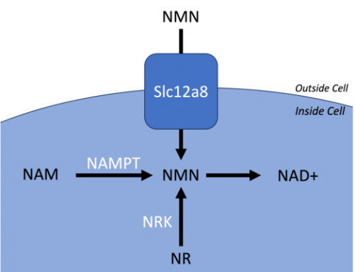 NAD +的另一种方式是从称为烟酰胺核苷(N )的 NAD前体产生,它被称为NRK(烟酰胺核苷激酶)的酶转化为NMN 。NMN也可以通过最近发现的一种名为Slc12a8的转运蛋白直接进入细胞。Slc12a8转运蛋白在全身的许多细胞中被发现,但在肠粘膜中含量最多,这表明我们的肠道细菌产生NMN。
