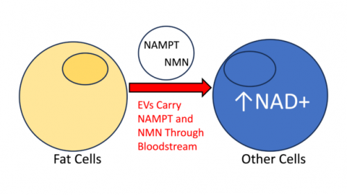 脂肪细胞在维持身体总 NAD +水平中的作用。 脂肪细胞分泌的膜结合囊称为细胞外囊(EVs)含有NAMPT或NMN。EV携带NAMPT和NMN到合成NAD +的其他细胞。具体来说,NAMPT将NAM转换为NMN,NMN直接转换为NAD+。