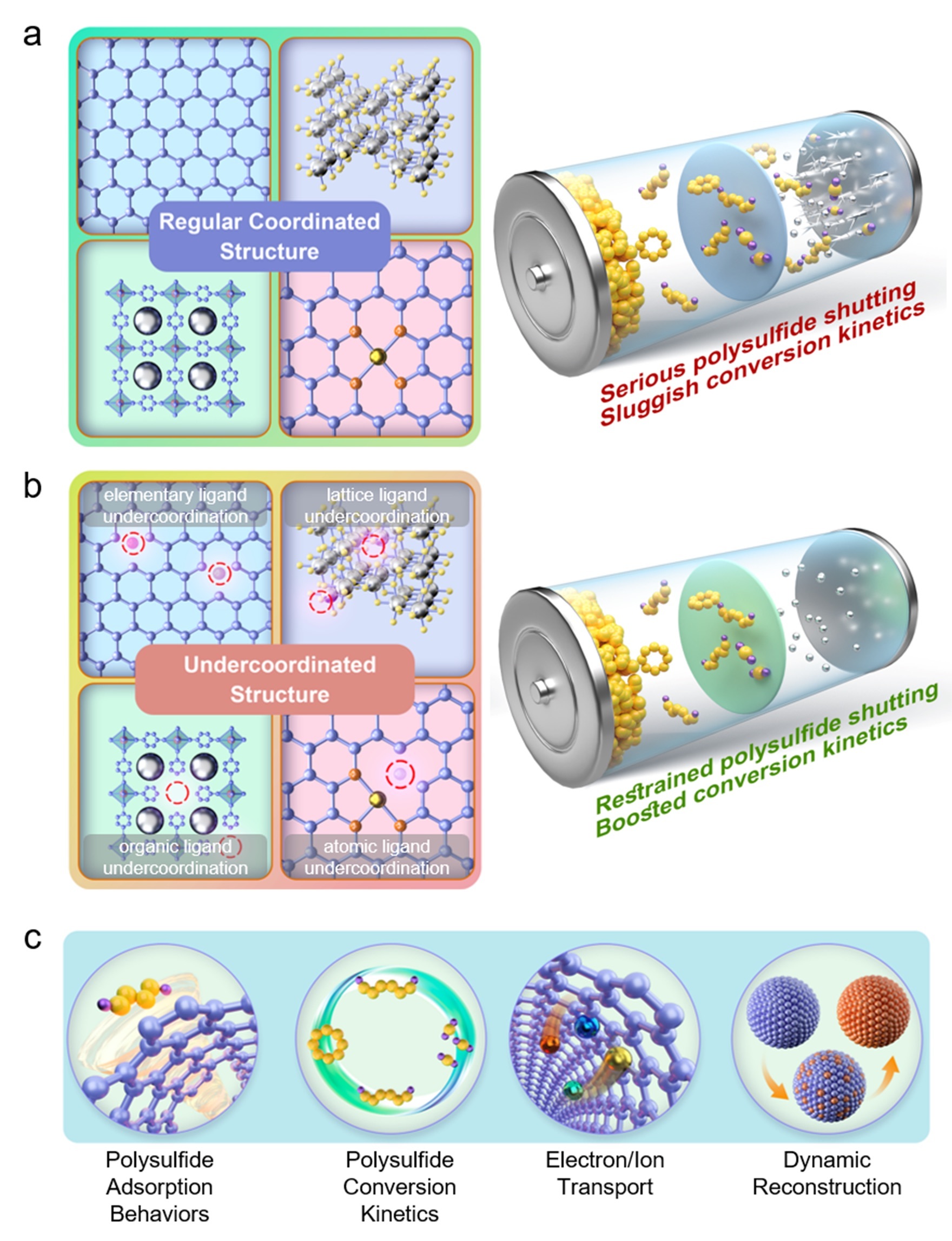 论文《Undercoordination Chemistry of Sulfur Electrocatalyst in Lithium-Sulfur Batteries》总结了硫催化剂设计中欠配位化学的最新进展,汇总了典型的欠配位材料结构和实施策略,并详细介绍其潜在作用机制,从多硫化锂吸附行为、多硫转化动力学、电子/离子输运和动态重构四个方面进行详细阐述,并对欠配位化学的未来发展方向进行了展望。