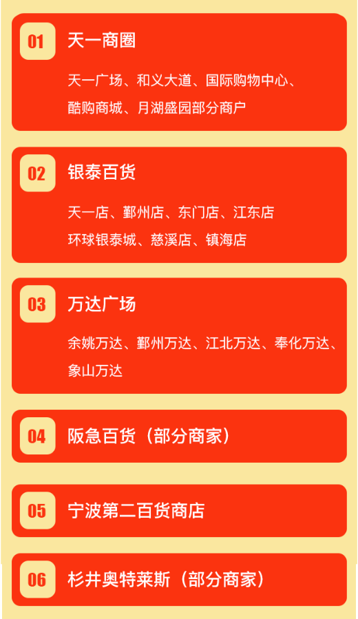 万达广场(余姚万达、鄞州万达、江北万达、奉化万达、象山万达)部分商户;