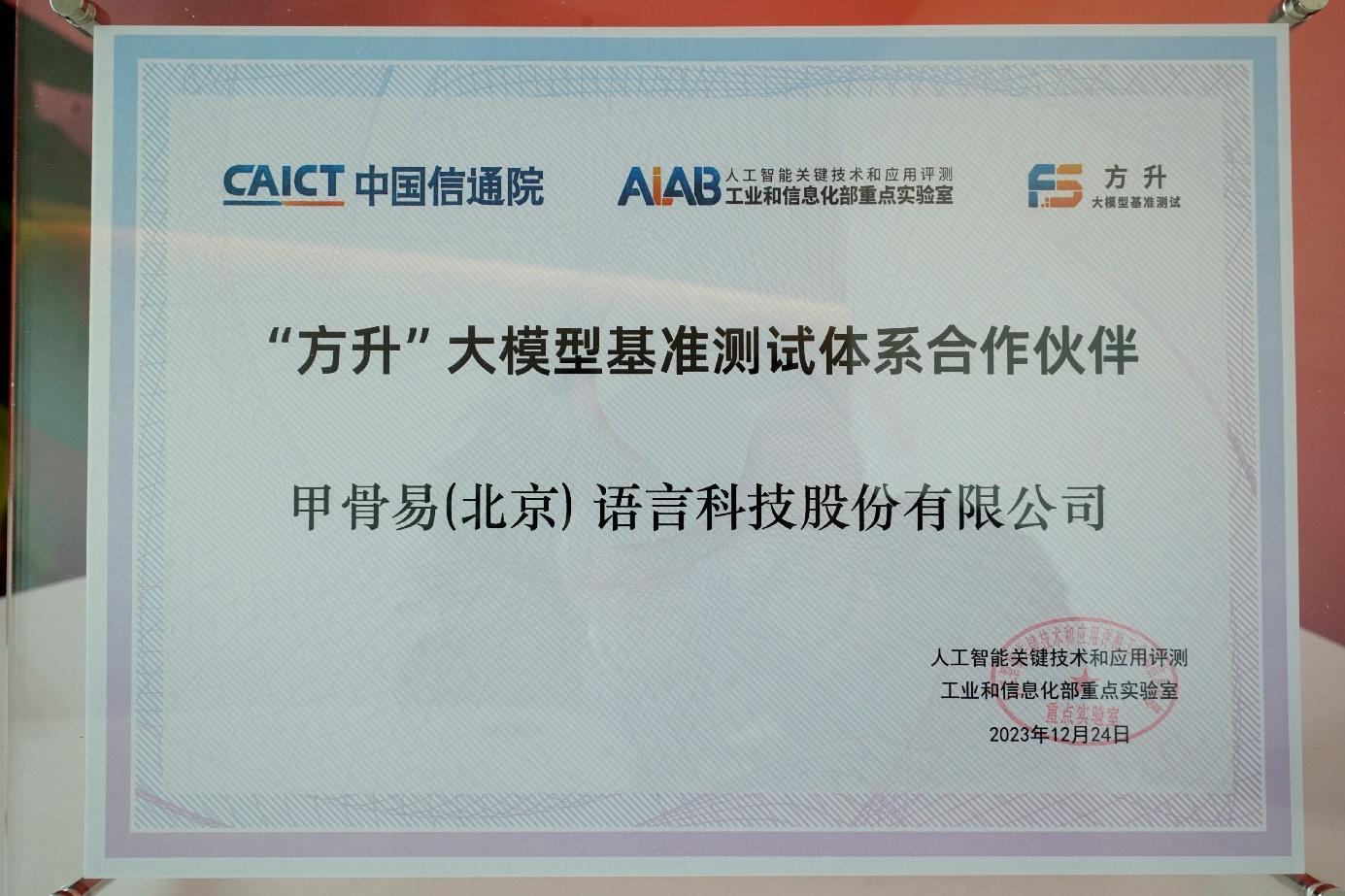 甲骨易获得中国信通院“大模型基准测试体系合作伙伴”证书