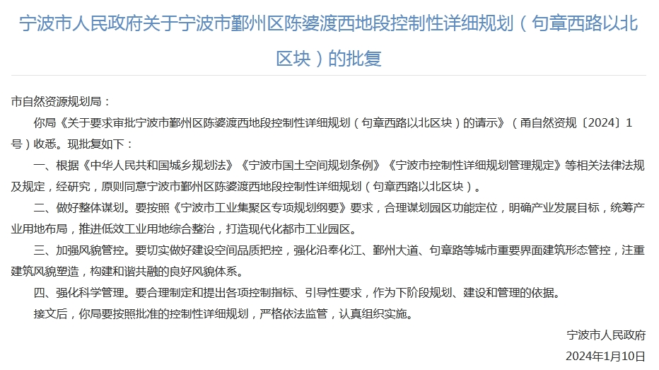 日前,市政府办公厅发布《宁波市人民政府关于宁波市鄞州区陈婆渡西地段控制性详细规划(句章西路以北区块)的批复》,原则同意宁波市鄞州区陈婆渡西地段控制性详细规划(句章西路以北区块)。