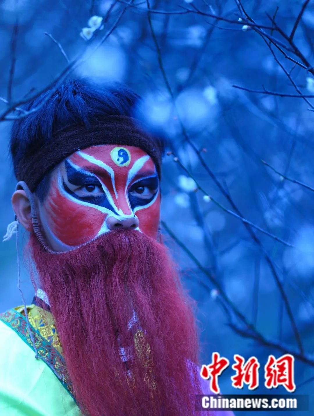 表演时,他的脸上画着两撇倒八眉,