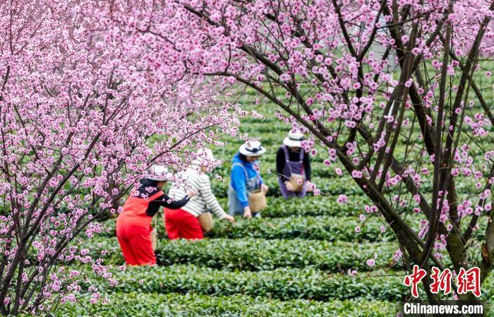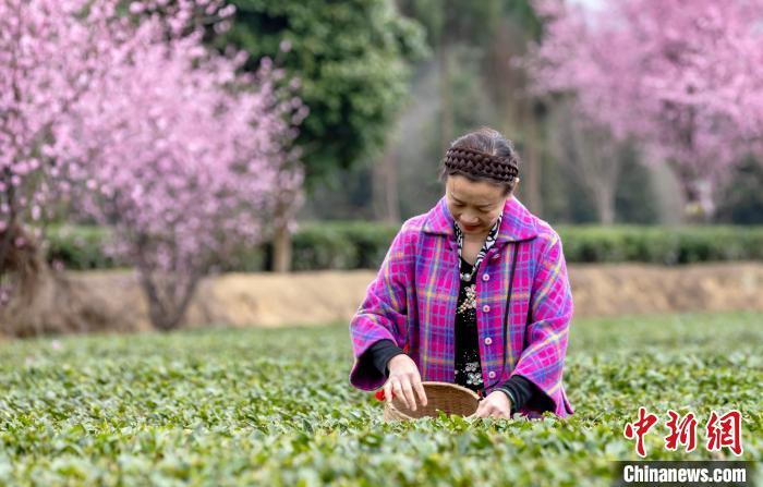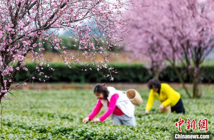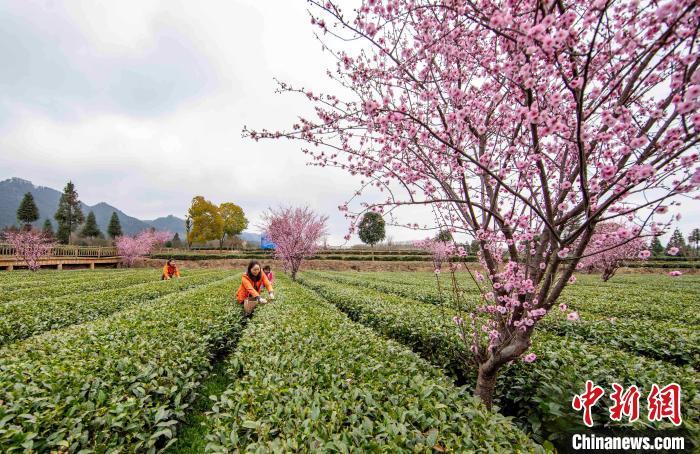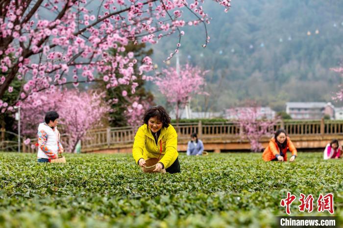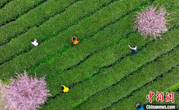 仲春时节,气温转暖,贵州省遵义市凤冈县茶园里的樱花盛开,茶树吐露新芽,各茶叶基地迎来采摘首批春茶的茶农和游客。