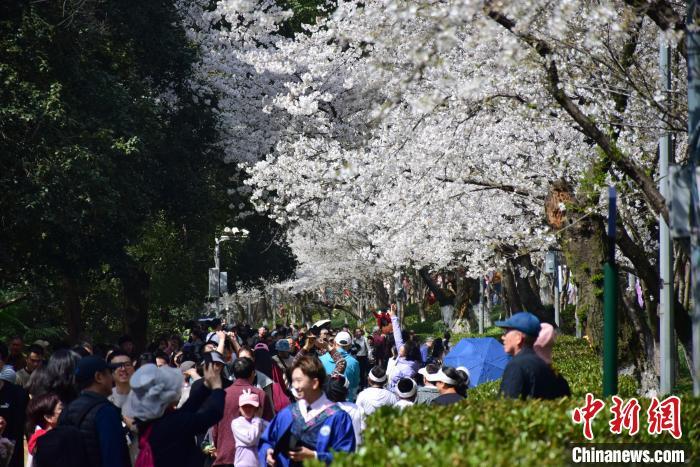 长约600余米的樱花大道上,人头攒动。连片绽放的樱花与飞檐翘角、碧瓦琉璃、灰墙红窗的早期建筑相映衬,吸引游客拍照打卡。现场,有人登上樱顶,俯瞰樱花盛放美景;有人身着汉服,与樱花同框留影……