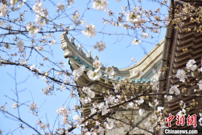 3月20日,武汉大学樱花绽放,与古建筑相映成画。 中新社记者 马芙蓉 摄
