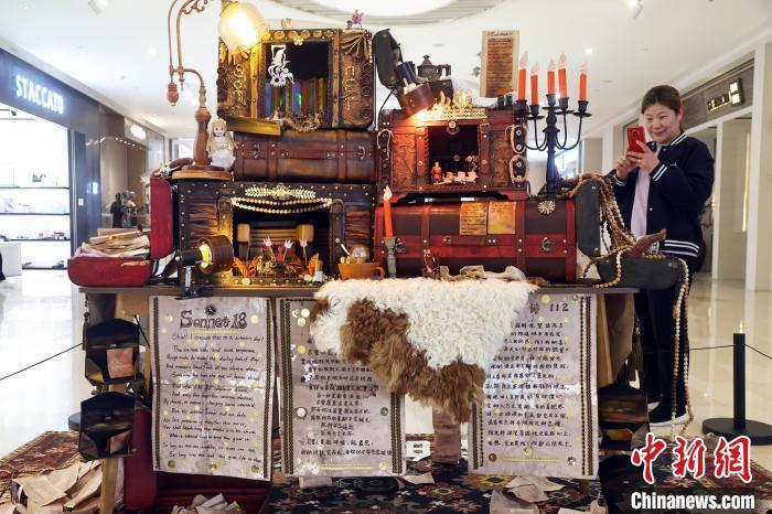 由二手防尘布,环保手套,旧电池制作而成的作品《布灵布灵》吸引路人。中新网记者 汤彦俊 摄