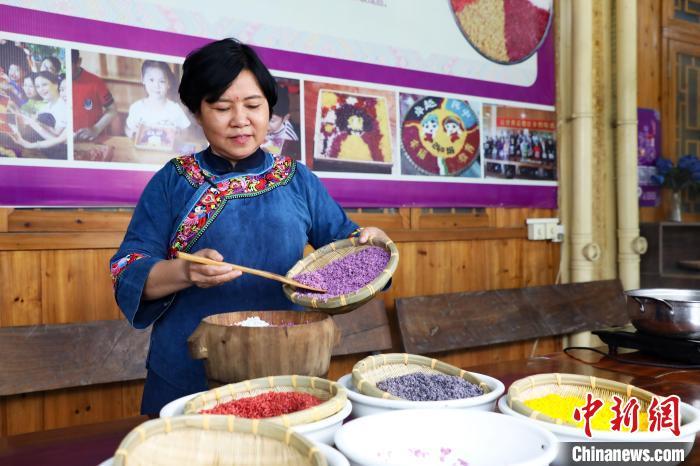 壮族五色糯米饭制作技艺代表性传承人潘红华在制作五色糯米饭。王伟臣 摄