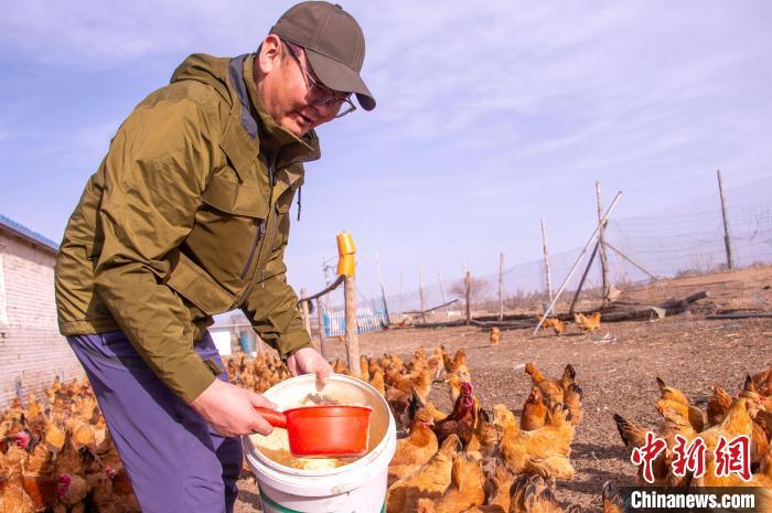 图为呼和图嘎正在鸡舍里喂鸡。管永新 摄