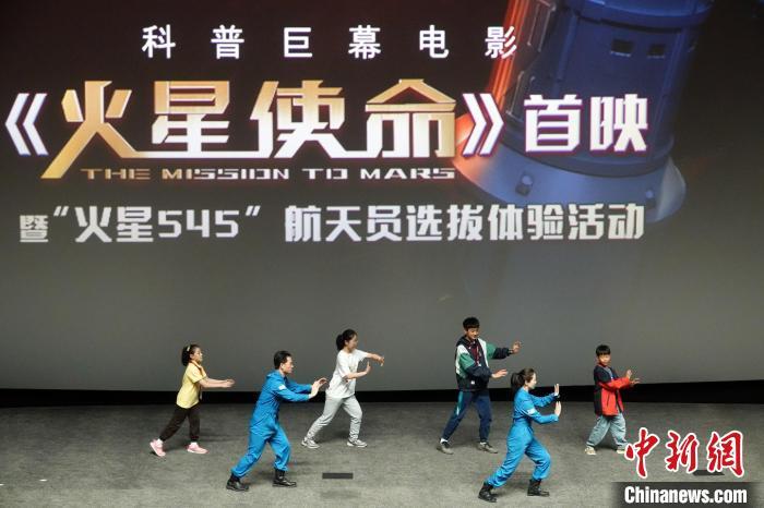 4月20日,北京,中国首部以航天员为题材的特效科普巨幕实拍电影《火星使命》在中国科技馆巨幕影院举行首映式,图为映前互动交流环节的太空太极拳教学。中新网记者 孙自法 摄