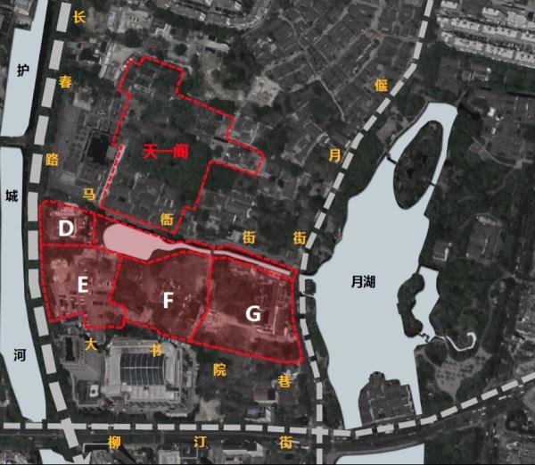 项目分区功能参见下图。其中,G地块为天一阁博物院南馆的展览交流区,D、E地块拟作为典藏修复(服务)区,F地块拟作为文化休闲区: