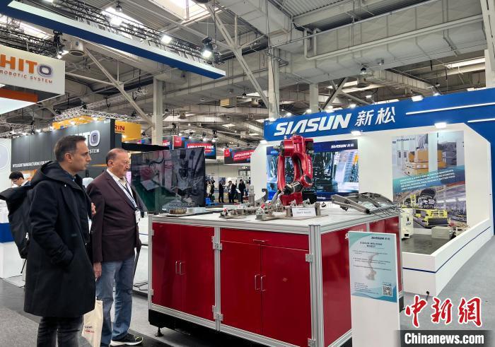 新松机器人自动化有限公司参展2024年汉诺威工业博览会。图为观众4月22日在该公司展位驻足。中新社记者 马秀秀 摄