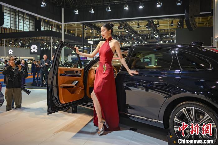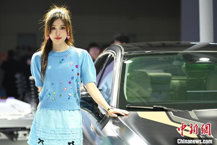 模特在展出的汽车旁展示。中新网记者 泱波 摄