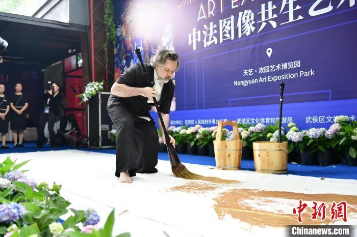 5月10日,四川成都,法国艺术家克里斯·卡尔维特在中法图像共生艺术展开幕式现场创作。 (成都市人民政府外事办公室供图)