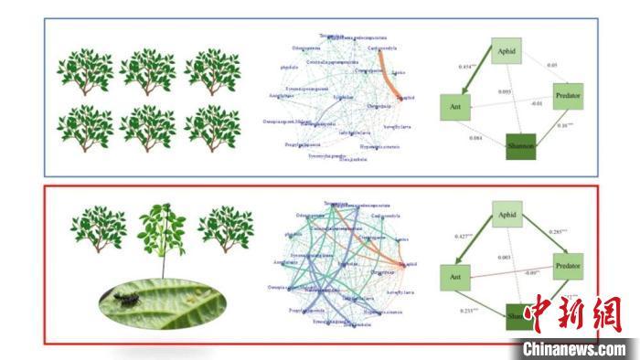 图为单作茶园(上图)和诱集植物间作茶园(下图)模型分析。中国科学院西双版纳热带植物园供图