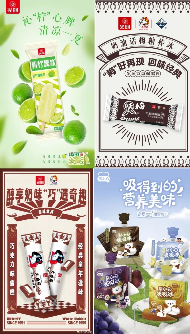 百年老字号光明冷饮不断创新,焕发品牌新活力,持续推出夏日新品,为消费者带来一场冰凉的味蕾盛宴。光明大白兔巧克力味雪糕,实现巧克力与大白兔的经典碰撞;熊小白成长系列冰淇淋营养美味,陪伴孩子们健康成长;光明×大白兔奶油话梅糖棒冰酸甜可口,满足对味蕾的探索;光明青柠棒冰清新怡人,满满果香果味,正是这些美味新品,让这个夏天更加清爽宜人。此外,还有光明白雪低脂风味酸牛奶上新,焕新包装,灵感来自于上海博物馆珍藏的桃花双图,寓意着长寿与美好祝福;光明畅优“天天超畅”系列富含光明自主研发的植物乳植杆菌ST—Ⅲ,畅饮零负担,为消费者带来健康活力。