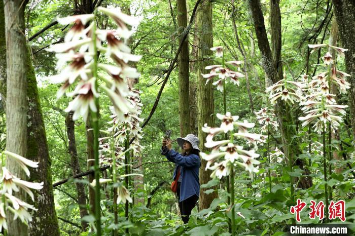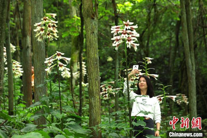 图为一名女孩在贵州省剑河县南寨镇岔路村乌皆溪林场拍摄野生大百合花。杨家孟 摄