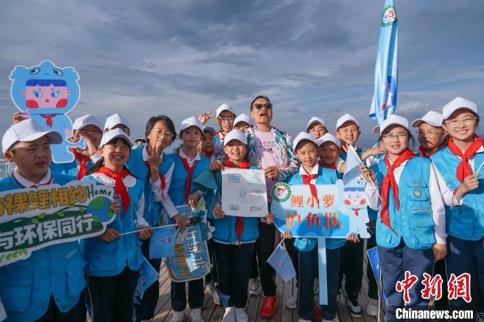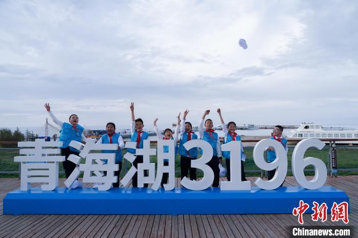 图为小学生在青海湖二郎剑景区内向游客科普青海湖裸鲤知识,并与游客合照留念。马铭言摄