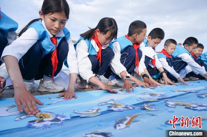 图为小学生在青海湖二郎剑景区内绘制长卷画“裸鲤徜徉图”。马铭言摄